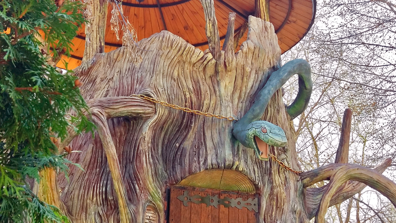 Дети же будут в восторге от Поляны сказок, ведь где еще можно встретить настоящую русалку на ветвях и кота ученого, о котором все знают с самых юных лет? Погружению в сказку способствует также посещение зоопарка с настоящими львами и медведями!